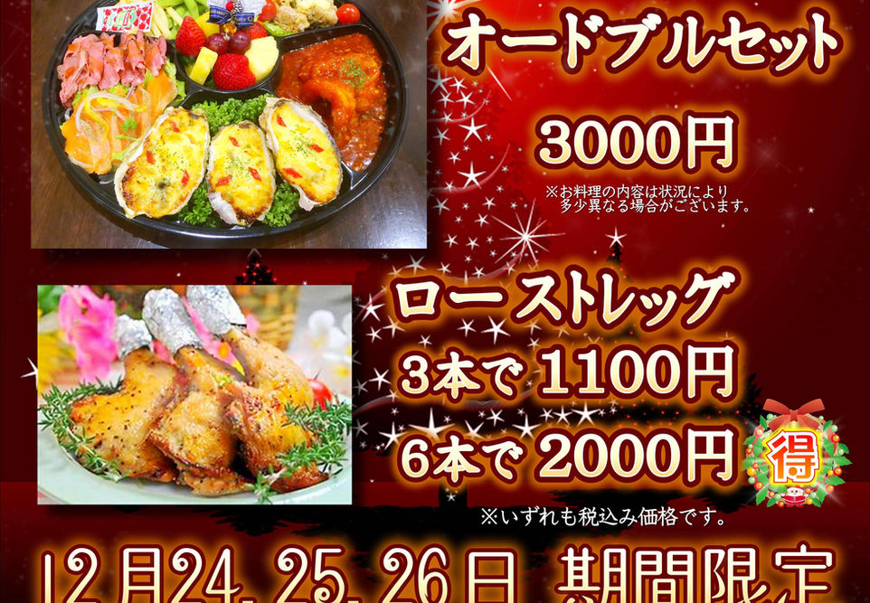 受け渡し:12月24日、25日、26日 14:00〜19:00
