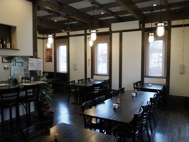 店舗は平屋で、天井が高く作られている。梁が剥き出しで、蔵のようなつくりだ。古いようでいて、ファンがまわりシックで特徴的な照明が優しく照らしてくれる。席は、テーブル席とカウンター席、個室になるボックス席が用意されていて、人数も多く入れそうだ。